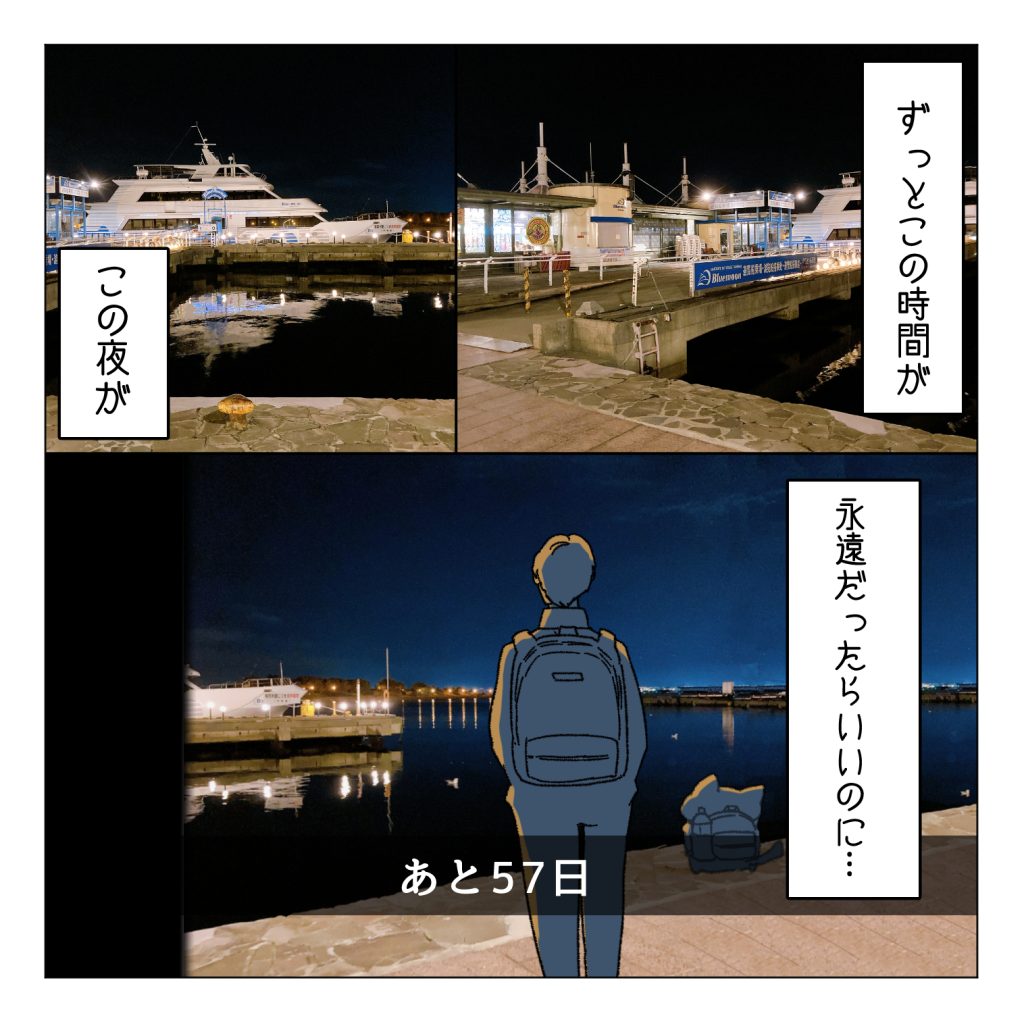 スポンサーリンクおすすめ記事マタハラする上司のせいで会社が死ぬほど嫌い【112...バーで「うっせぇわ」を歌ったら陽キャの洗礼を浴びる...【1】一人になった家事猫のこれから連載一覧AmazonKindle作品 【あと57日】100日後に死ぬ難病の夫と100日後にひとりぼっちになる猫2025.10.222025.11.03スポンサーリンク1話目から1番はじめのお話前のお話 他の連載も見てね広告函館の夜は静かで空気が澄んでました… 続きます…次の更新のお話はこちら上の画像TAPすると次のお話へ飛べますAmazonKindleでしたら49話まで読めます7