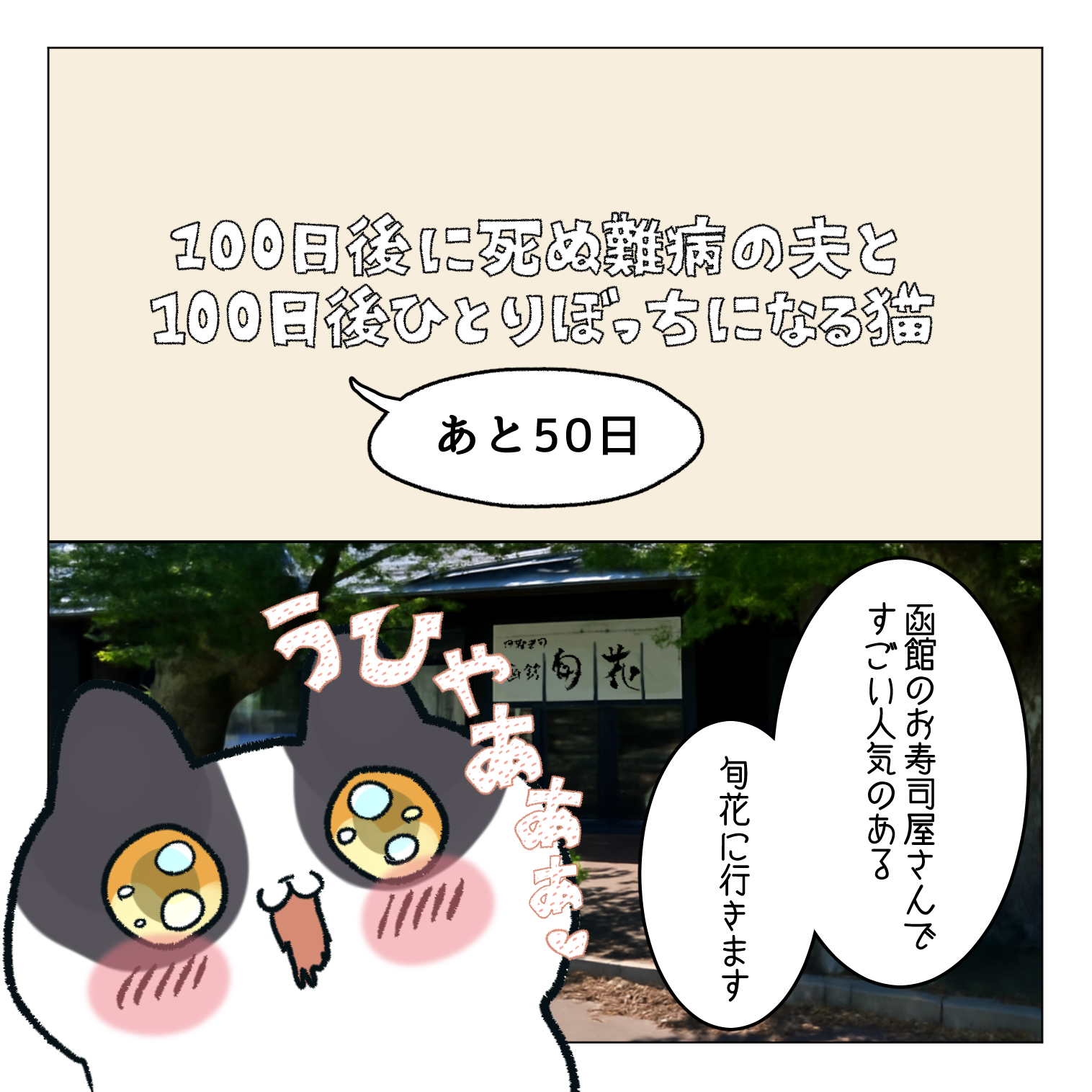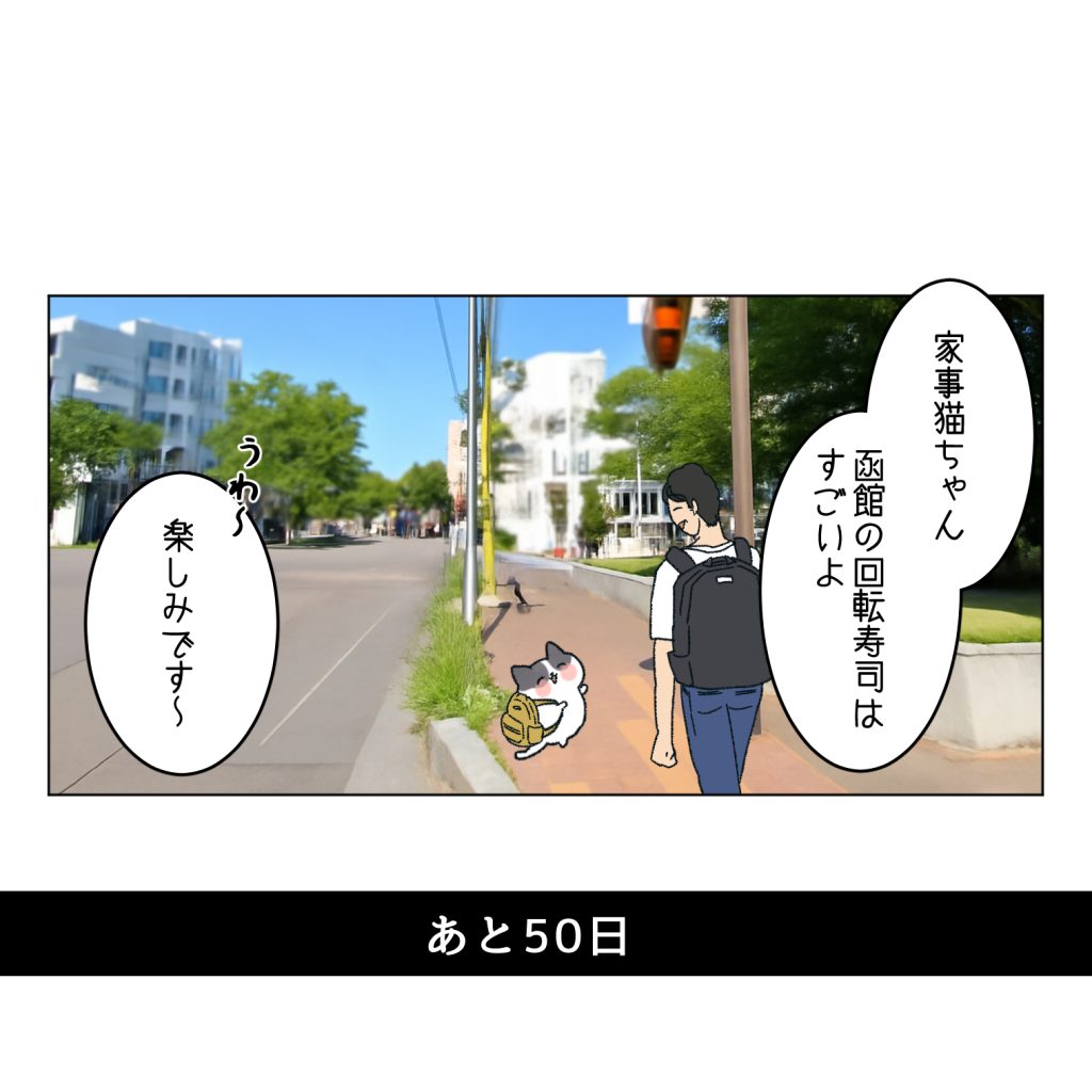 スポンサーリンクおすすめ記事マタハラする上司のせいで会社が死ぬほど嫌い【112...バーで「うっせぇわ」を歌ったら陽キャの洗礼を浴びる...【1】一人になった家事猫のこれから連載一覧AmazonKindle作品 【あと50日】100日後に死ぬ難病の夫と100日後にひとりぼっちになる猫2025.11.052025.11.07スポンサーリンク1話目から前のお話 他の連載も見てね 広告函館の風がすごく好きになりました 続きます…次の更新のお話はこちら広告上の画像TAPすると次のお話へ飛べますAmazonKindleでしたらアーリー版(改訂版制作予定)43話まで無料で読めます5