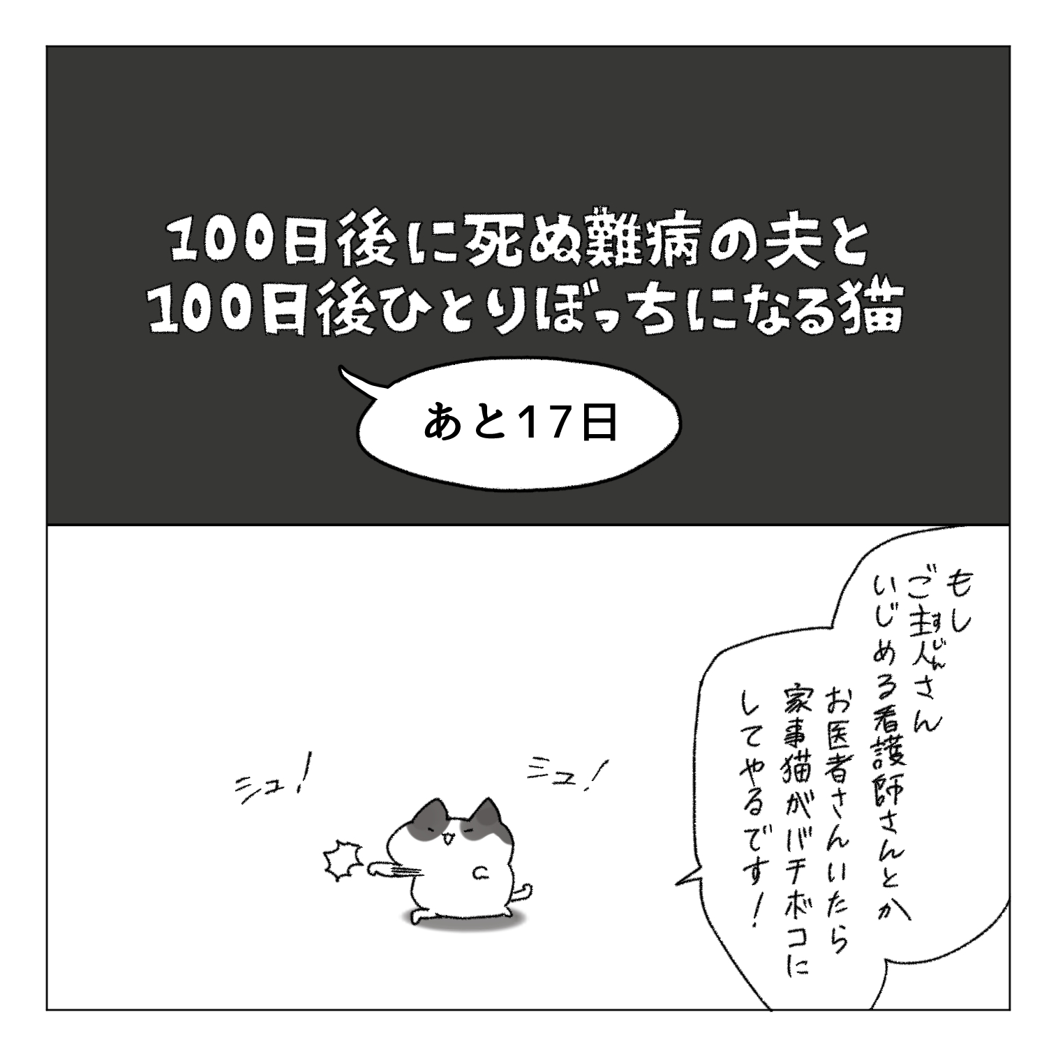 スポンサーリンクおすすめ記事マタハラする上司のせいで会社が死ぬほど嫌い【112...バーで「うっせぇわ」を歌ったら陽キャの洗礼を浴びる...【1】一人になった家事猫のこれから連載一覧AmazonKindle作品 【あと17日】100日後に死ぬ難病の夫と100日後にひとりぼっちになる猫2026.01.102026.01.12スポンサーリンク1話目から前のお話 他の連載も見てね広告なんだか入院させてしまった方が不味かったような気がしました。 続きます…次の更新のお話はこちら上の画像TAPすると次のお話へ飛べますAmazonKindleにて20話まで無料で読めます5