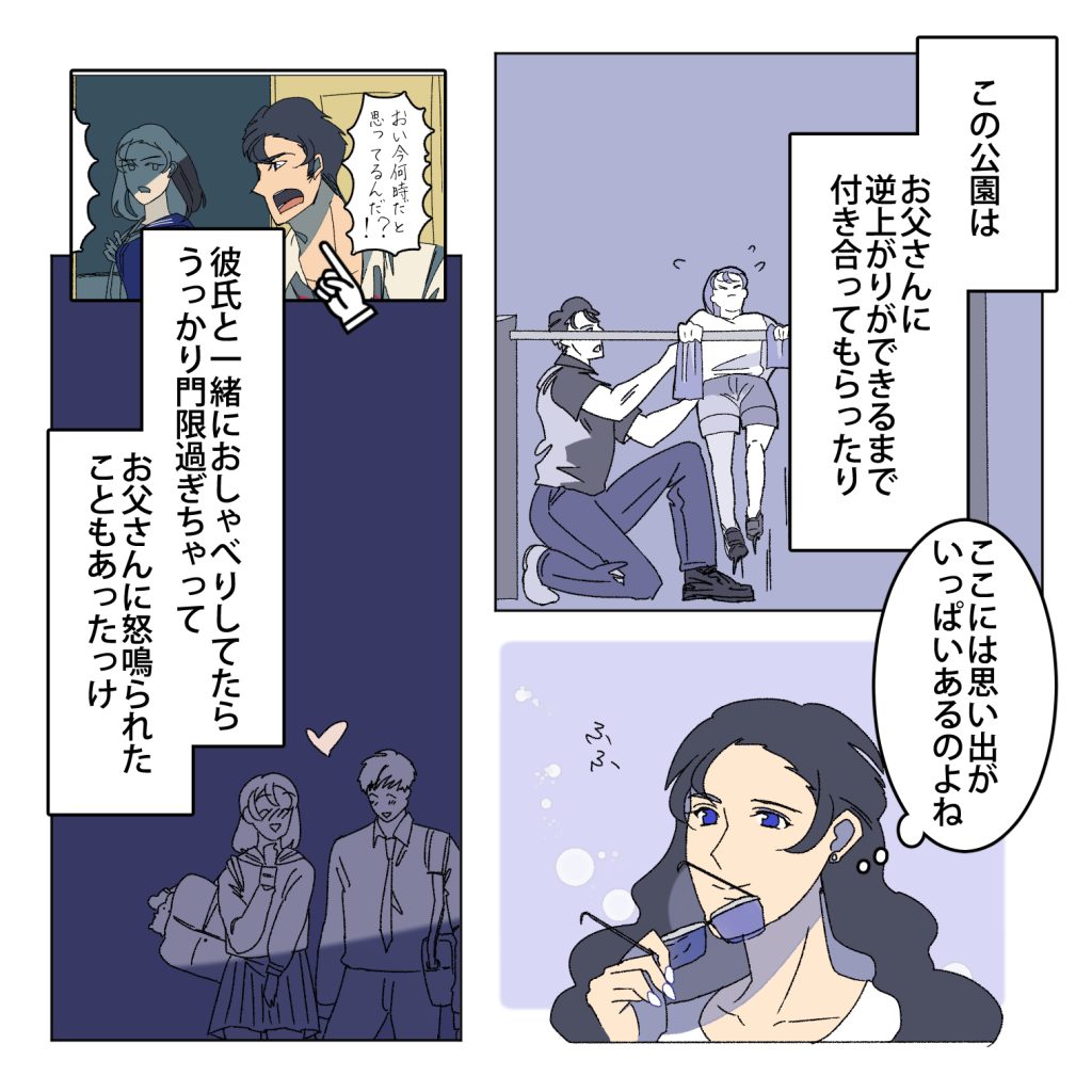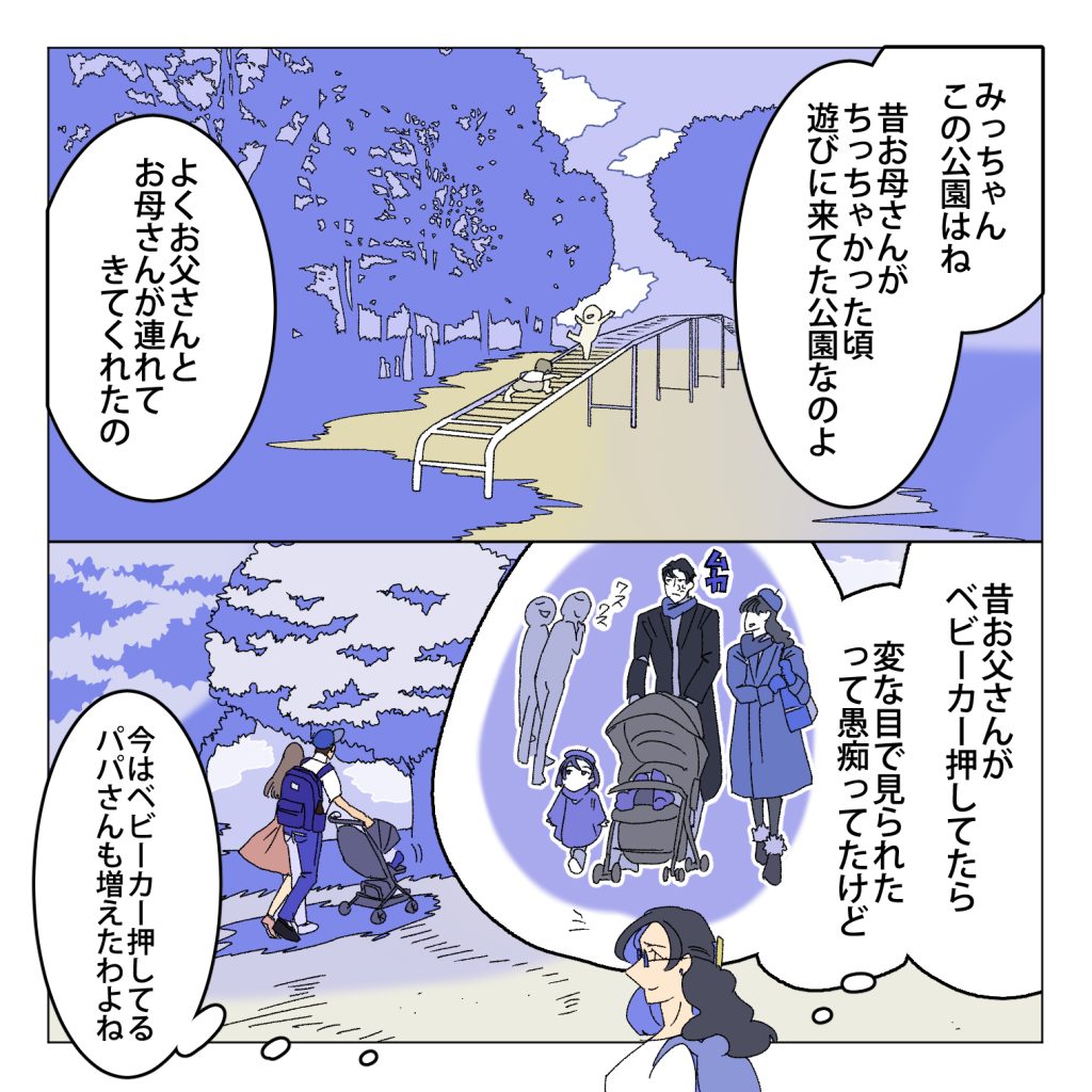 嫁ちゃん「1コマ目タオルを使って逆上がりのレクチャーしてくれる若き日のじいじそして2コマ目のは3話のお話で実は結ちゃん彼ピッピと楽しくおしゃべりしてたのですね」