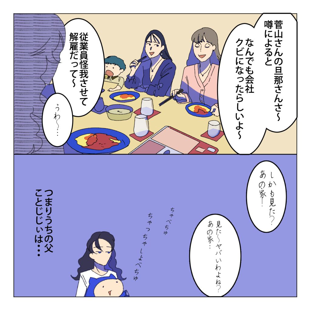 嫁ちゃん「みんな菅山さんの旦那さんの話に夢中になって気づかないかもしれないけど結ちゃんが一番オムライスの減り方が早いのはモブママさんたちの話にあまり入れてないから黙々とオムライス食べてるから一番減り方が早いっていうね。嫁ちゃんじゃなきゃ見逃しちゃうね!」