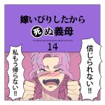 スポンサーリンクおすすめ記事明るい髪色の素敵おばあになりた〜いマタハラする上司のせいで会社が死ぬほど嫌い【112...【1】一人になった家事猫のこれから連載一覧AmazonKindle作品 嫁いびりしたから死ぬ義母【15】2024.09.242024.09.28スポンサーリンク嫁いびりしたから死ぬ義母の一話目はこちら嫁いびりしたから死ぬ義母【1】【家事しないと死ぬ旦那】ぜひこちらもご覧ください 前回のお話はこちら嫁いびりしたから死ぬ義母【14】【家事しないと離婚だから】ぜひこちらもご覧ください 嫁ちゃん「,ということで時間は13話の帰ってきた場面に戻りまして義母と話し合いです!!」広告嫁ちゃん「旦那くんを味方につけて帰ってきた嫁ちゃんに困惑して涙目になる義母」 . 嫁ちゃん「何様?って人様に言う人に本当に偉い人はいない説あると思います」2024年9月25日2p加筆修正しました。次の更新のお話はこちら嫁いびりしたから死ぬ義母【16】【家事しないと死ぬ旦那】ぜひこちらもご覧ください他のおすすめのシリーズはこちら広告家事しないなら離婚だから【1】【家事しないと死ぬ旦那】ぜひこちらもご覧ください 旦那くんには弟がいた【1】【家事しないと死ぬ旦那】ぜひこちらもご覧ください 家事しないと死ぬ嫁ちゃん【1】ぜひこちらもご覧ください 簓さんは普通の彼氏が欲しい【1】ぜひこちらもご覧ください 広告砂かけババァ公園に現る【1】【孫が可愛くて死んじゃうじじぃ】ぜひこちらもご覧ください 嫁いびりしたから死ぬ義母【1】【家事しないと死ぬ旦那】ぜひこちらもご覧ください 【Amazon Kindle版無料で公開中です】10年も付き合ったから結婚したい結は大好きだった母の死をきっかけに自殺をしようと試みますがそれを助けてくれたのが秋君だった。結は命を助けてくれた秋君に運命を感じますがこの秋君とんでもないモラハラクズ野郎だった!?令和なのに家事しないクズ男どもは制裁!スカッと系漫画家事しないと死ぬ旦那1高学歴高収入高身長イケメンだけどクソモラ男とうっかり結婚してしまった嫁ちゃんモラ仕草したくせに離婚するって言い出したらロミオって嫁ちゃんに迷惑かけるしで誰がこの男を止めて!!家事しないと死ぬ旦那2とんでもモラハラ男の旦那くんとその旦那くんと長男教で旦那くんを寵愛する毒親に苦しめられた弟くんとの戦い!!その決着は・・・「女に立たせてもらわなきゃ立てねーような男はぶっ倒れてろ!!」簓さんは普通の彼氏が欲しい 簓さんは親が超大手法律事務所代表の由緒正しい弁護士の家系にして自身も有名お嬢様学校に通う超ハイスペ女子高生の簓さんの悩みは彼氏が欲しいことだった。でもそんな彼女の好きな男性の好みは『普通の彼氏!?』そんなこんなで簓さんの彼氏になった二十六木櫂くんは実は普通じゃない彼氏で・・・!? 4