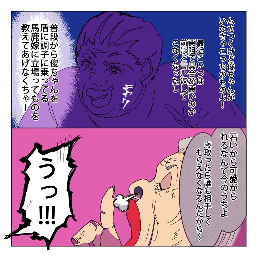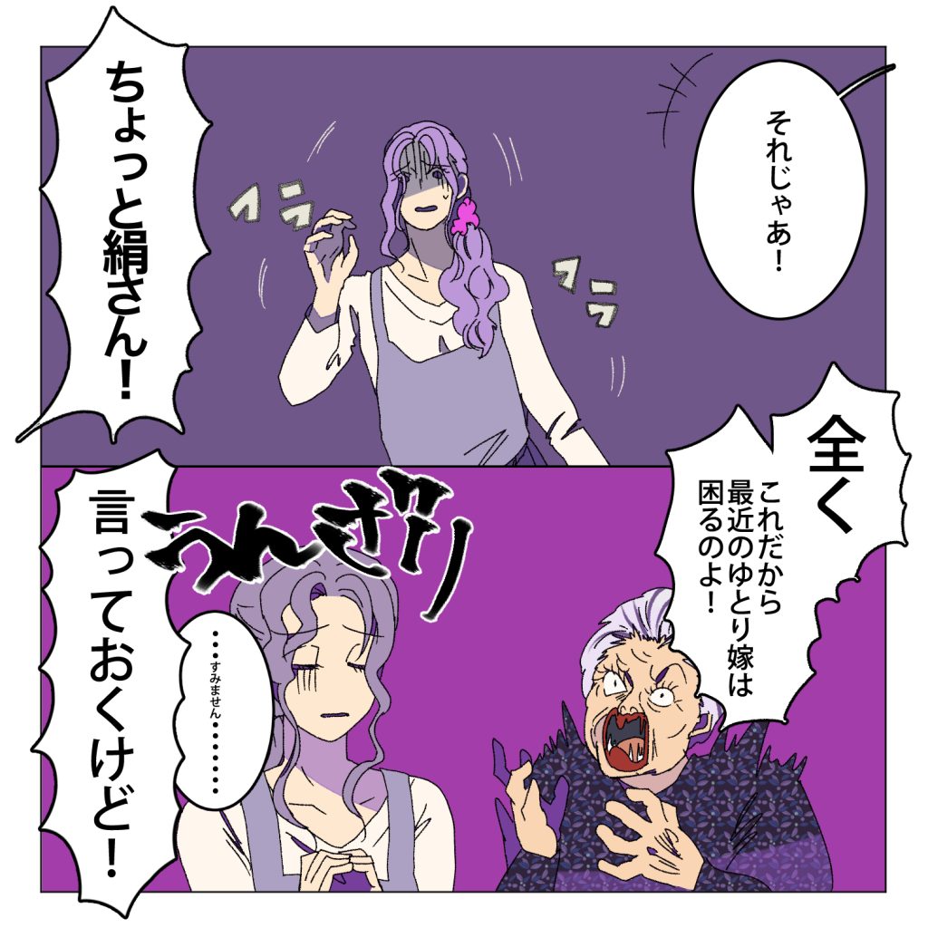 スポンサーリンクおすすめ記事明るい髪色の素敵おばあになりた〜いマタハラする上司のせいで会社が死ぬほど嫌い【112...【1】一人になった家事猫のこれから連載一覧AmazonKindle作品 嫁いびりしたから死ぬ義母【23】2024.10.022024.10.03スポンサーリンク嫁いびりしたから死ぬ義母の一話目はこちら嫁いびりしたから死ぬ義母【1】【家事しないと死ぬ旦那】ぜひこちらもご覧ください 前回のお話はこちら嫁いびりしたから死ぬ義母【22】【家事しないと死ぬ旦那】ぜひこちらもご覧ください 広告嫁ちゃん「これはまさかあの日の出来事の義母視点・・・!」 広告 嫁ちゃん「!!・・・・・・・・・・。」 .嫁ちゃん「おのれ邪悪な地球外生命体いや・・・魔女め!!魔女狩りが必要なようだな・・・!」次の更新のお話はこちら嫁いびりしたから死ぬ義母【24】【家事しないと死ぬ旦那】ぜひこちらもご覧ください 他のおすすめのシリーズはこちら家事しないなら離婚だから【1】【家事しないと死ぬ旦那】ぜひこちらもご覧ください 旦那くんには弟がいた【1】【家事しないと死ぬ旦那】ぜひこちらもご覧ください 広告家事しないと死ぬ嫁ちゃん【1】ぜひこちらもご覧ください 簓さんは普通の彼氏が欲しい【1】ぜひこちらもご覧ください 砂かけババァ公園に現る【1】【孫が可愛くて死んじゃうじじぃ】ぜひこちらもご覧ください 嫁いびりしたから死ぬ義母【1】【家事しないと死ぬ旦那】ぜひこちらもご覧ください 【Amazon Kindle版無料で公開中です】10年も付き合ったから結婚したい結は大好きだった母の死をきっかけに自殺をしようと試みますがそれを助けてくれたのが秋君だった。結は命を助けてくれた秋君に運命を感じますがこの秋君とんでもないモラハラクズ野郎だった!?令和なのに家事しないクズ男どもは制裁!スカッと系漫画家事しないと死ぬ旦那1高学歴高収入高身長イケメンだけどクソモラ男とうっかり結婚してしまった嫁ちゃんモラ仕草したくせに離婚するって言い出したらロミオって嫁ちゃんに迷惑かけるしで誰がこの男を止めて!!広告家事しないと死ぬ旦那2とんでもモラハラ男の旦那くんとその旦那くんと長男教で旦那くんを寵愛する毒親に苦しめられた弟くんとの戦い!!その決着は・・・「女に立たせてもらわなきゃ立てねーような男はぶっ倒れてろ!!」簓さんは普通の彼氏が欲しい 簓さんは親が超大手法律事務所代表の由緒正しい弁護士の家系にして自身も有名お嬢様学校に通う超ハイスペ女子高生の簓さんの悩みは彼氏が欲しいことだった。でもそんな彼女の好きな男性の好みは『普通の彼氏!?』そんなこんなで簓さんの彼氏になった二十六木櫂くんは実は普通じゃない彼氏で・・・!?2