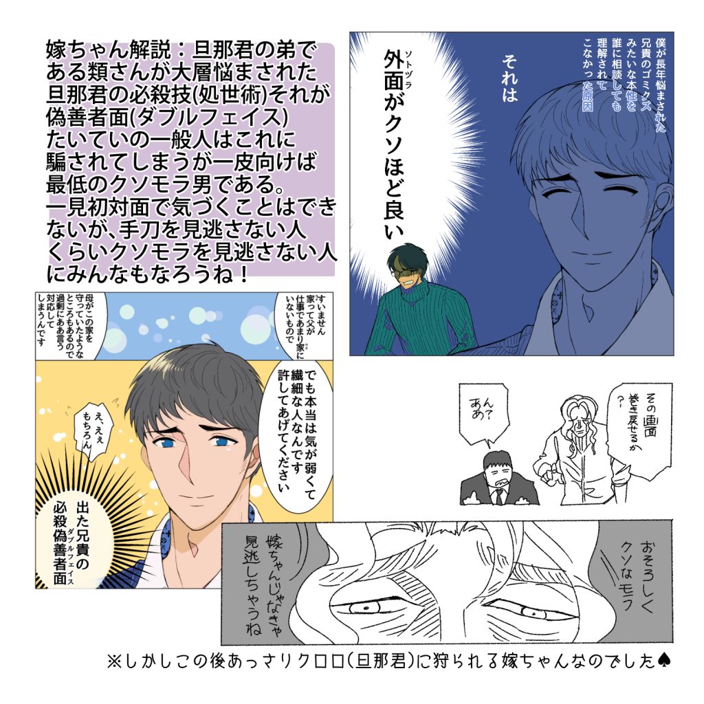スポンサーリンクおすすめ記事明るい髪色の素敵おばあになりた〜いマタハラする上司のせいで会社が死ぬほど嫌い【112...【1】一人になった家事猫のこれから連載一覧AmazonKindle作品 嫁いびりしたから死ぬ義母【28】2024.10.082024.10.10スポンサーリンク嫁いびりしたから死ぬ義母の一話目はこちら嫁いびりしたから死ぬ義母【1】【家事しないと死ぬ旦那】ぜひこちらもご覧ください 前回のお話はこちら嫁いびりしたから死ぬ義母【27】【家事しないと死ぬ旦那】ぜひこちらもご覧ください 広告嫁ちゃん「旦那君銃を突きつけられたのは初めて?肩の力抜きな。秋田ではよくあることだよ。慣れろ」広告.嫁ちゃん「旦那君日頃から山の声を聞き、猪や熊と死闘を繰り広げているパッパの前では旦那君の小細工は通用しないんだよ」おまけ【旦那君には弟がいた9話にて】次の更新のお話はこちら嫁いびりしたから死ぬ義母【29】【家事しないと死ぬ旦那】ぜひこちらもご覧ください 他のおすすめのシリーズはこちら家事しないなら離婚だから【1】【家事しないと死ぬ旦那】ぜひこちらもご覧ください 広告旦那くんには弟がいた【1】【家事しないと死ぬ旦那】ぜひこちらもご覧ください 家事しないと死ぬ嫁ちゃん【1】ぜひこちらもご覧ください 簓さんは普通の彼氏が欲しい【1】ぜひこちらもご覧ください 砂かけババァ公園に現る【1】【孫が可愛くて死んじゃうじじぃ】ぜひこちらもご覧ください 嫁いびりしたから死ぬ義母【1】【家事しないと死ぬ旦那】ぜひこちらもご覧ください 【Amazon Kindle版無料で公開中です】10年も付き合ったから結婚したい結は大好きだった母の死をきっかけに自殺をしようと試みますがそれを助けてくれたのが秋君だった。結は命を助けてくれた秋君に運命を感じますがこの秋君とんでもないモラハラクズ野郎だった!?令和なのに家事しないクズ男どもは制裁!スカッと系漫画家事しないと死ぬ旦那1高学歴高収入高身長イケメンだけどクソモラ男とうっかり結婚してしまった嫁ちゃんモラ仕草したくせに離婚するって言い出したらロミオって嫁ちゃんに迷惑かけるしで誰がこの男を止めて!!家事しないと死ぬ旦那2とんでもモラハラ男の旦那くんとその旦那くんと長男教で旦那くんを寵愛する毒親に苦しめられた弟くんとの戦い!!その決着は・・・「女に立たせてもらわなきゃ立てねーような男はぶっ倒れてろ!!」簓さんは普通の彼氏が欲しい 簓さんは親が超大手法律事務所代表の由緒正しい弁護士の家系にして自身も有名お嬢様学校に通う超ハイスペ女子高生の簓さんの悩みは彼氏が欲しいことだった。でもそんな彼女の好きな男性の好みは『普通の彼氏!?』そんなこんなで簓さんの彼氏になった二十六木櫂くんは実は普通じゃない彼氏で・・・!? 3