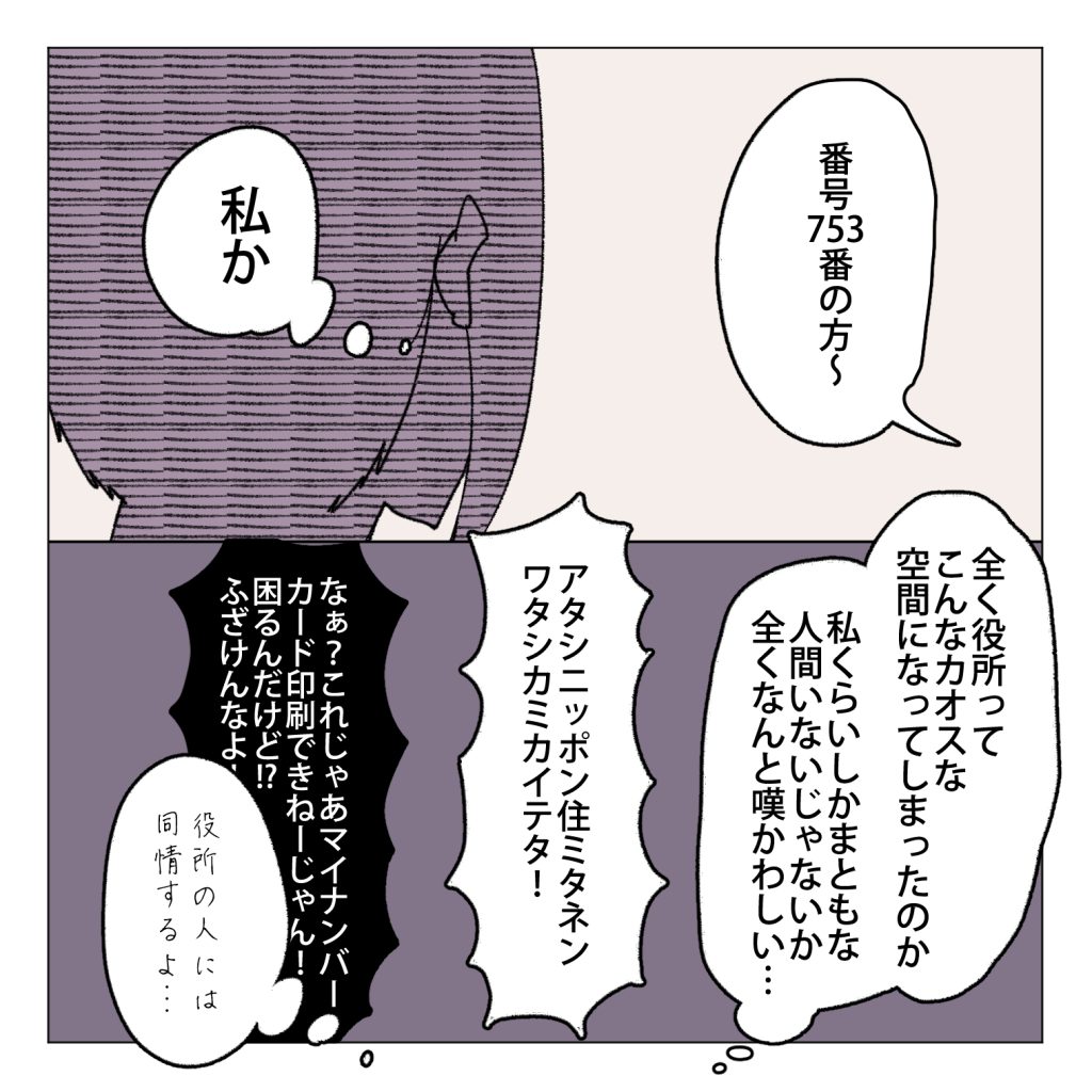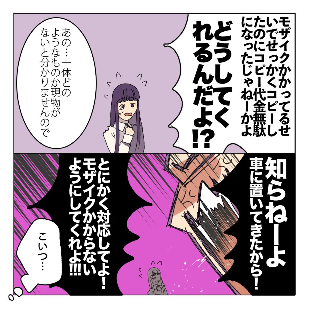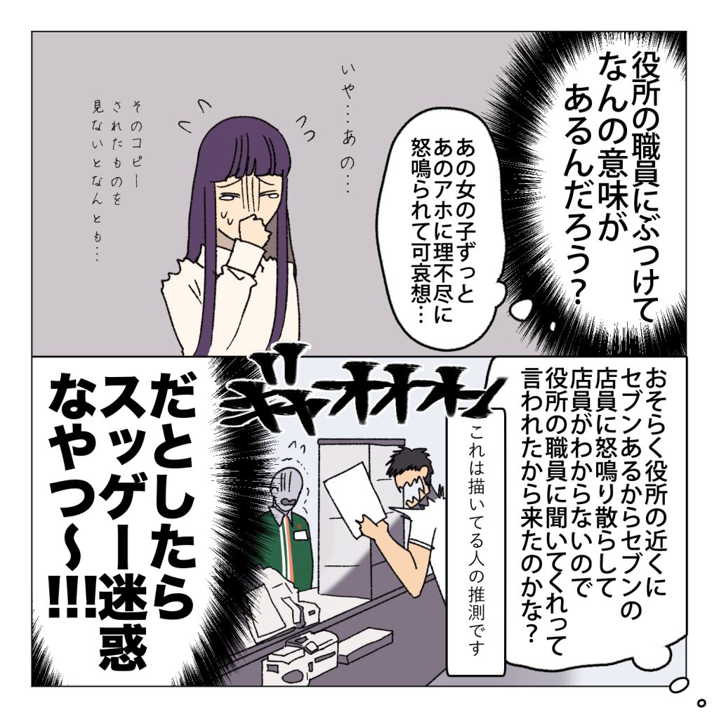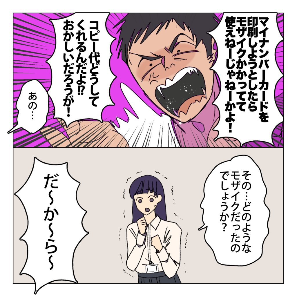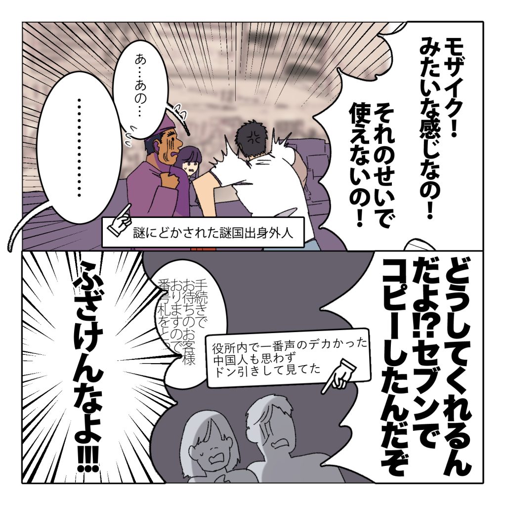 これね…こいつ実はあまりに言動が支離滅裂すぎて一つ一つ記憶できないレベルにめちゃくちゃに捲し立ててたのでこちらの漫画だとマイナンバーカードをセブンの印刷機でコピーしたらモザイクかかってギャオオオンと言ってるように見えるけど実物は言ってること意味不明で描いてる人が家に帰ってからこう言いたかったのかな?と解釈してるだけで実は違かった可能性もありという…外国人だらけで言葉が違う人だらけの環境で困惑しましたが同じ日本人で日本語喋ってるはずの人が一番意味不明だったっていうオチね…